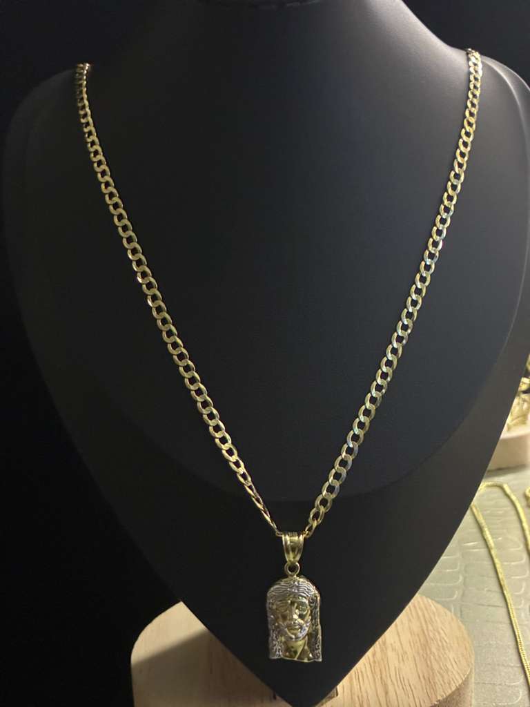 Este collar con la cara de Cristo en oro de 10 quilates destaca por su diseño refinado y su calidad excepcional. Fabricado en oro 10K, ofrece durabilidad y un acabado brillante que realza cualquier outfit. Ideal para llevar a diario o en ocasiones especiales, este accesorio simboliza con elegancia la tradición y la espiritualidad.